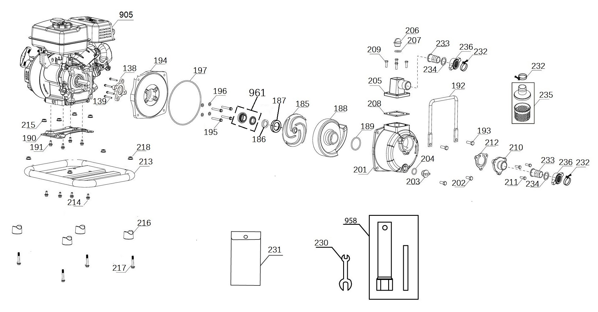 The GC-PW 16 petrol water pump is designed for quickly delivering large quantities of water, e.g. in order to supply service water where there is no connection to the electric power grid. The 1.75 kW four-stroke petrol engine provides sufficient torque for pumping up to 14.000 liters per hour to a delivery head of up to 28 meters. The pressure connection and the intake connection each have a G1½ male thread. The GC-PW 16 stands securely on robust, vibration-absorbing feet. The pump has a 1.3 liter tank for long operating phases. For user-friendly filling of the pump there is a water filler screw; a water drain screw is provided for draining away the residual water after use. A practical carry-handle makes for user-friendly transportation. Complete with two hose connection adapters size 38.1 mm (1.5"), two reducers to size G1 male thread and one intake cage with hose connection size 1.5".