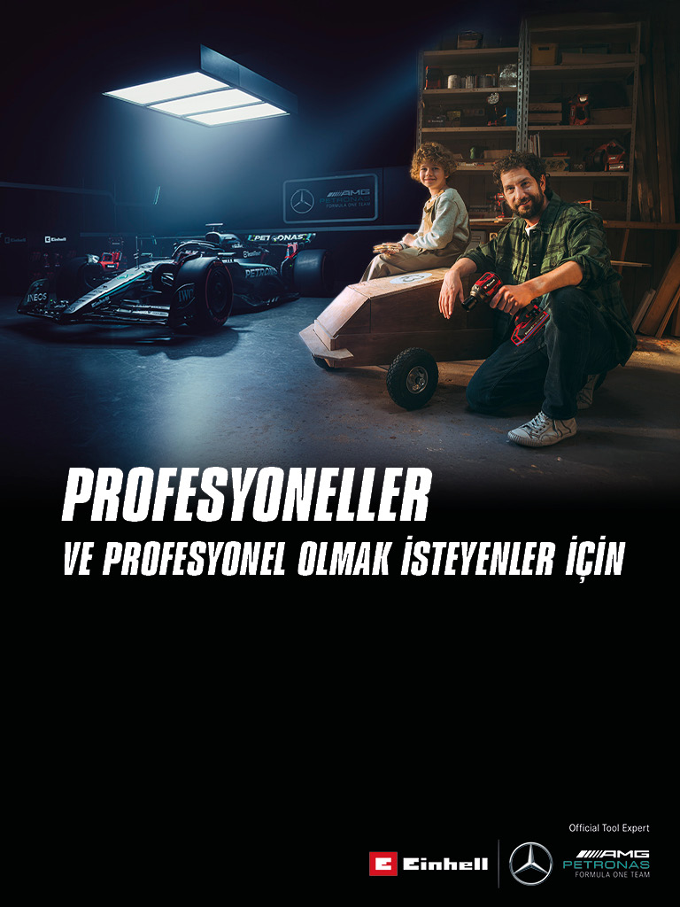 Einhell olarak her gün yeniden yarattığımız iki dünya arasındaki bağlantıyı, konumumuz eğlenceli bir şekilde gösteriyor: Mercedes-AMG PETRONAS Formula 1 Takımı'nın garajındaki profesyonellerin performans odaklı dünyası ile yaratıcı atöyle dünyası, baba ve oğulun aniden profesyonel araba tamircilerine dönüştüğü bir yer.
