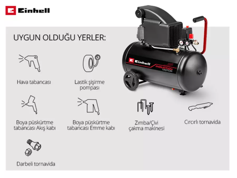 Einhell Kablosuz Kompresör TC-AC 270/50 Li OF-Solo, atölyede ve garajda güçlü ama taşınabilir bir yardımcıdır. Boya ve vernik uygulamak, aletleri çalıştırmak veya sadece lastikleri şişirmek için: 1.800 watt gücünde güçlü indüksiyon motoru ve 270 l/dk emme kapasitesi sayesinde kompresör her türlü göreve hazırdır. 10 bar'a kadar olan maksimum çalışma basıncı, bir basınç düşürücü ile ayarlanabilir. Bir tanesi düzenlenmemiş kazan basıncı, diğeri düzenlenmiş çalışma basıncı için olmak üzere iki adet basınç göstergesi bulunmaktadır. 50 litre hacimli büyük tank, birçok basınçlı hava işi için yeterli hava rezervi sunar. Taşıma kolu ve iki sağlam tekerlek sayesinde, yağla yağlanan kompresör istenen çalışma yerine hızlı ve kolay bir şekilde taşınabilir. Yoğuşmuş su, drenaj valfi aracılığıyla boşaltılabilir.