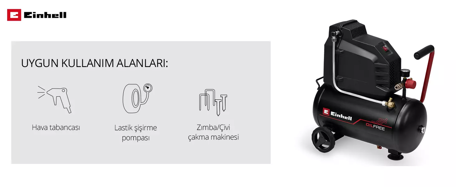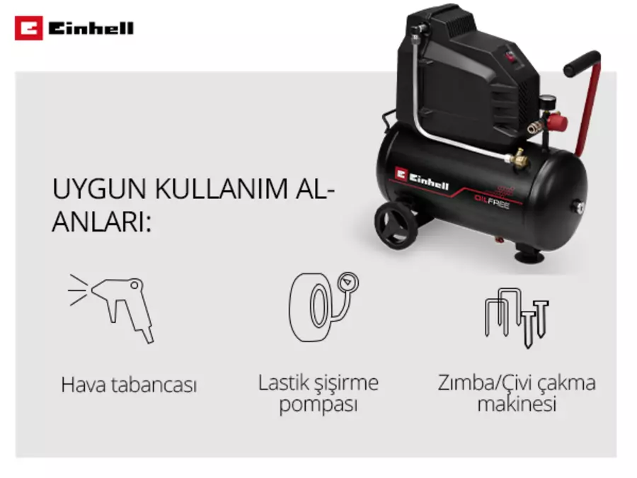Einhell Kompresör TC-AC 190/24/8 i, DIY tutkunları için ideal olan güçlü ve çok yönlü bir kompresördür. 1.100 watt güce sahip sağlam endüksiyon motoru sayesinde, yoğun emek gerektiren uygulamalarda bile sürekli performans sağlar. Yağsız pompa minimum bakım sağlar ve 190 l/dak emme kapasitesi sağlar. Çıkış 4 bar'da 75 l/dak'dır. Bu, kompresörü özellikle atölyelerde veya garajlarda kullanım için uygun hale getirir. Dahili basınç regülatörü ile çalışma basıncı, maksimum 8 bar değerine kadar hassas bir şekilde ayarlanabilir. Çalışma basıncını izlemek için kolay okunan bir basınç göstergesi dahili olarak bulunur ve optimum sonuçlar elde etmek için doğru kontrol ve ayar sağlar. Ayrıca, titreşimle sönümlenmiş taban, daha uzun kullanım sürelerinde bile çalışma sırasında güvenli ve dengeli bir duruş sağlar. Buna ek olarak, kullanışlı taşıma kolu ve sağlam tekerlekler kompresörün taşınmasını kolaylaştırır, böylece kompresör çeşitli uygulamalar için kullanılabilir. Tankın korozyonuna karşı 10 yıllık garanti ile Einhell Kompresör TC-AC 190/24/8 i özellikle yüksek dayanıklılık sunar ve bu nedenle birçok proje için güvenilir bir seçimdir.