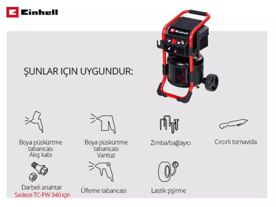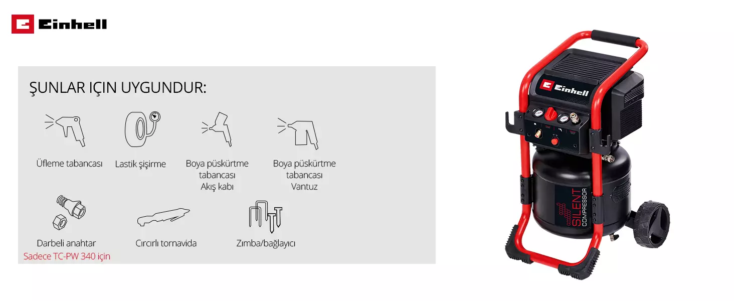 Einhell Kompresör TE-AC 240/24 Silent, çeşitli basınçlı hava uygulamaları için pratik ve çok yönlü bir üründür. 1.500 watt motor gücü, 240 l/dk'ya kadar emiş kapasitesi ve 24 litre hacmindeki tankı ile bu kompakt kompresör, her garaj ve atölyenin vazgeçilmez ekipmanıdır. Basınç düşürücü yardımıyla, hava basıncı çeşitli uygulamalar için maksimum 10 bar'a kadar ayarlanabilir. Düzenlenmiş çalışma basıncı ve kazan basıncı, ilgili basınç göstergesinden okunabilir. Basınçlı hava aletleri, hızlı bağlantı kaplini ile kolayca bağlanabilir. Geleneksel kompresörlere kıyasla, TE-AC 240/24 Silent 70 dB'lik (LpA değeri) düşük bir gürültü seviyesine sahiptir. Yağsız pompa ve kazandaki suyun kolay tahliyesini sağlayan drenaj valfi sayesinde, kompresör az bakım gerektirir. Kompakt, dikey tasarımı sayesinde kompresör yerden tasarruf sağlayacak şekilde saklanabilir. Üniteye, güç kablosu için saklama bölmesi ve ayrıca temin edilebilen basınçlı hava aksesuarları için kauçuk kaplı bir raf yerleştirilmiştir. Tekerlekler ve taşıma kolu kompresörün taşınmasını kolaylaştırır.